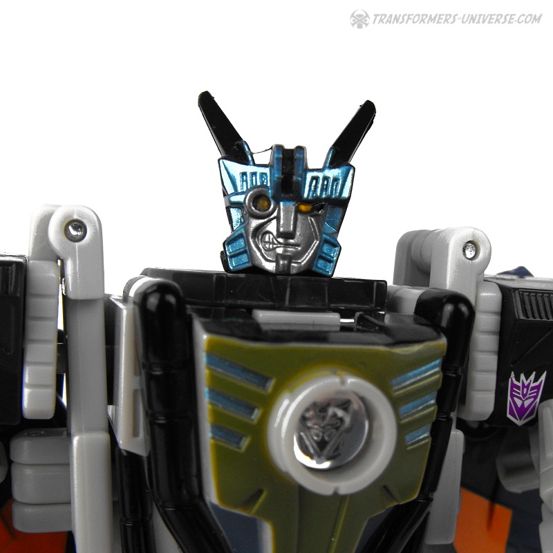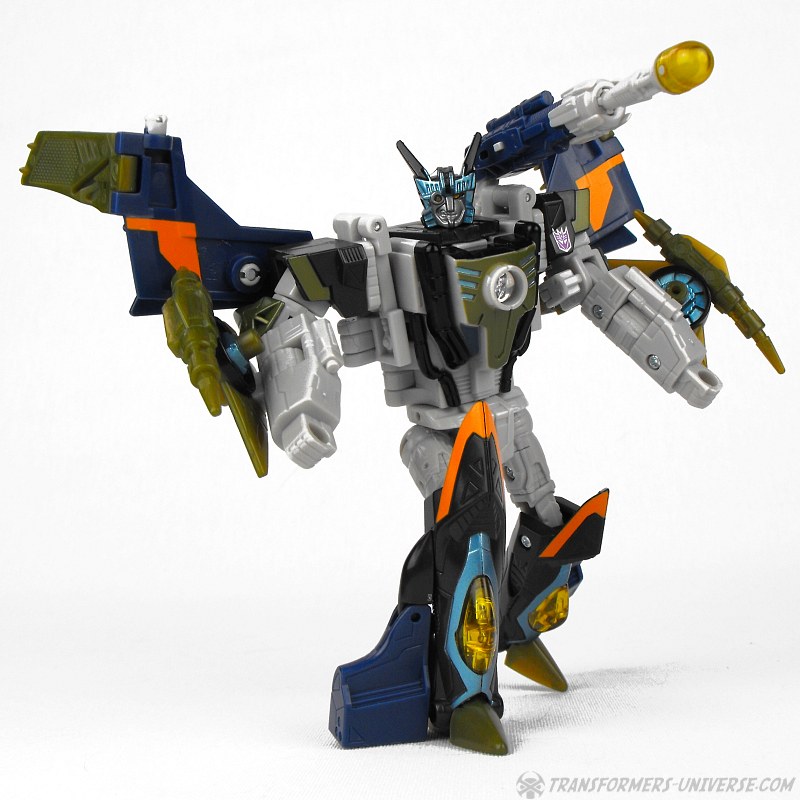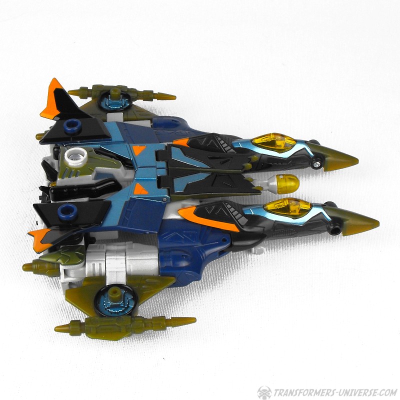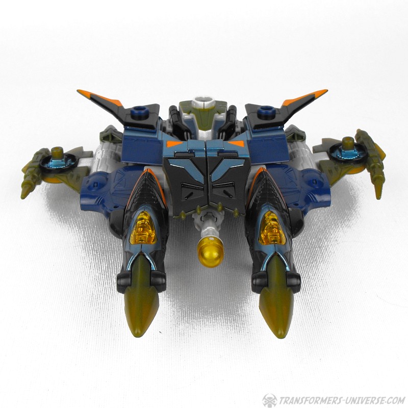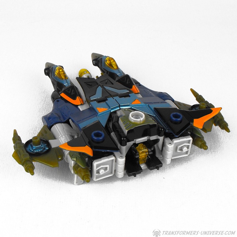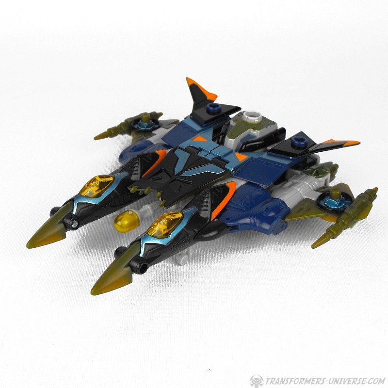 Vehicle Mode: Slugslinger transforms into a jet, one who has taken its look from its G1 predecessor. A double cockpit und short, stubby wings coupled with a futuristic look. His large shoulder cannon now rest underneath the belly and juts out between the cockpits. The jet has a functional landing gear and an all-around good look to it, except that it does seem a bit less than aerodynamic.