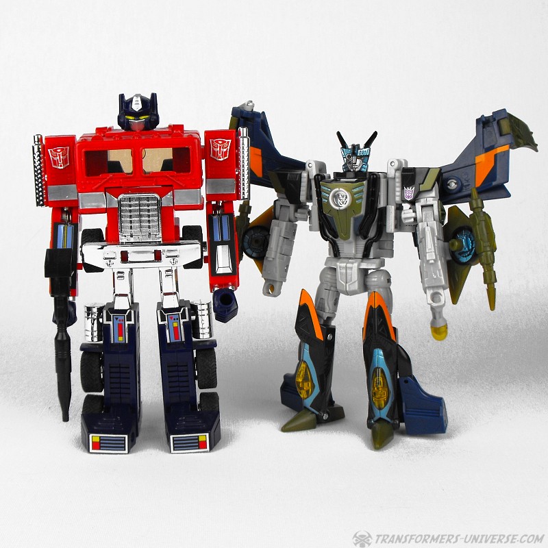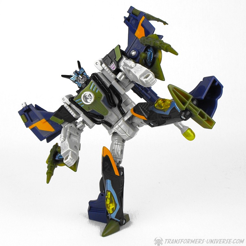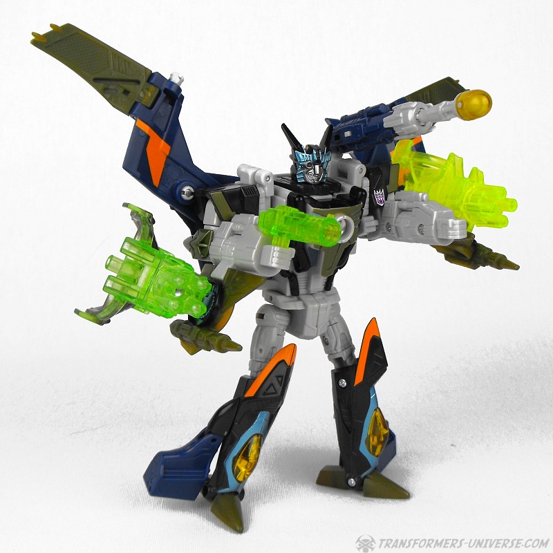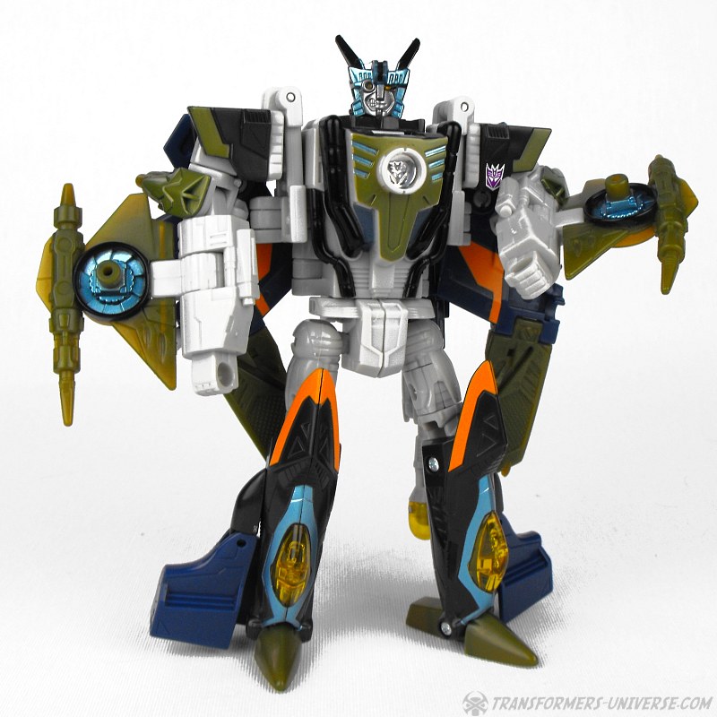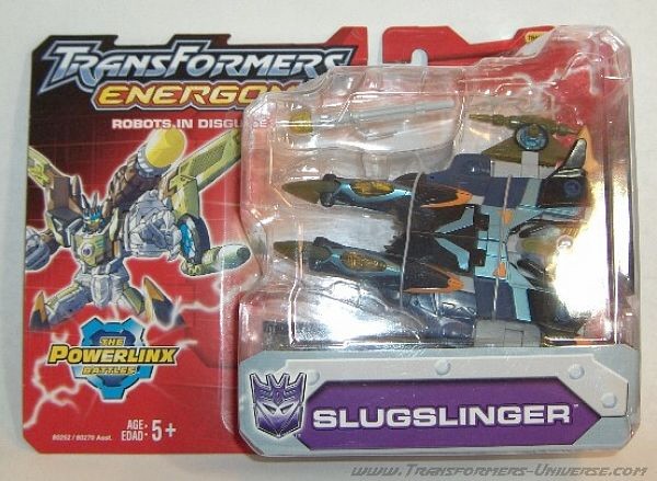 Slugslinger is a crude and vile Decepticon. His ariel speed and battle tactics are the two reasons that Megatron keeps him around. He takes just as much pleasure in starting trouble between his own teammates as he does fighting Autobots. In robot mode, this troublemaker possesses an impressive weapons arsenal. Many Autobots try to avoid a direct gun fight with him. In vehicle mode, Slugslinger's speed and endurance in the air are second only to Megatron.