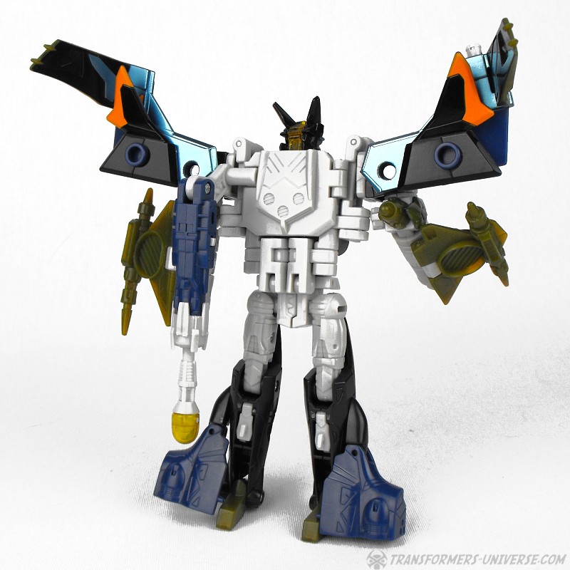 Robot Mode: Slugslinger is a winged robot with good posability and a somewhat strange-looking face. One eye has a monocle-like sensor on it and the side of his mouth is drawn up in a half-grin. Strange. Apart from that he looks uite good, but suffers from some problems with his construction. His arms are hampered by the jet landing gear (and are a bit malformed anyway) und if he swivels his huge gun back the missile hinders the leg movement. I like his look, but these minor flaws drag him down somewhat.