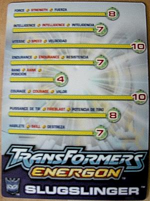 Remarks: Slugslinger is one of those Transformers that were made exclusively for the toy stores, he never appeared in the cartoon. Maybe that's part of the reason why he seems to have been constructed somewhat half-heartedly. He's not a bad toy, but does have some avoidable flaws. As reinforcement to the Energon Decepticons he makes a decent figure. Recommended to completists.