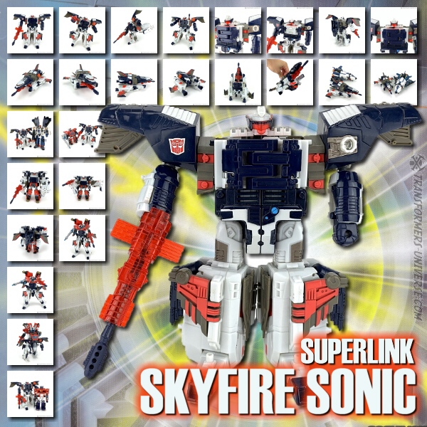 Prelude: Skyfire, often called Jetfire, was a mainstay in many Transformers series, including those comprising the Unicron Trilogy. In those, his most important job was to powerlink with someone (Optimus Prime in many cases), and he would also receive at least one power-up / repaint per series. In the Takara version of Transformers Energon, Superlink, that power-up repaint was called Skyfire Sonic (or possibly Sonic Skyfire) and here he is in all his chunky glory. Let’s say go!