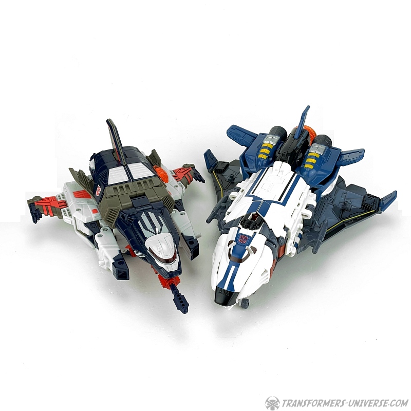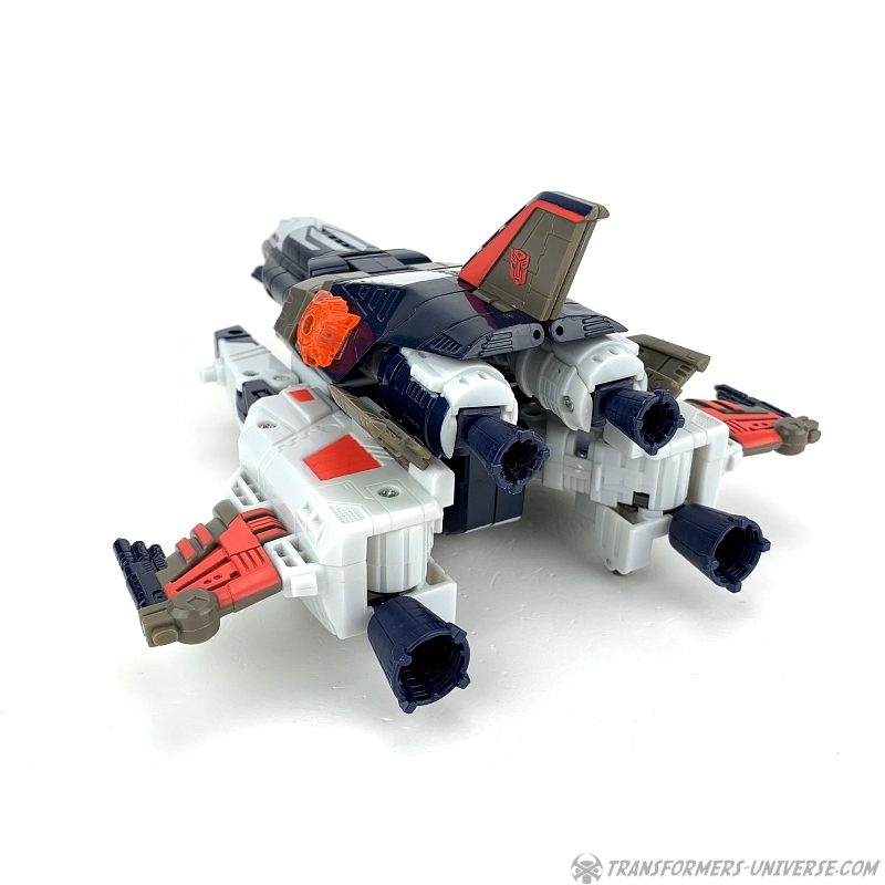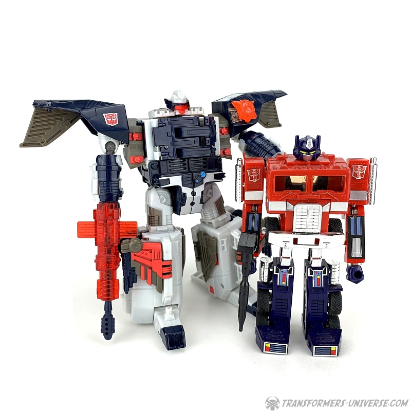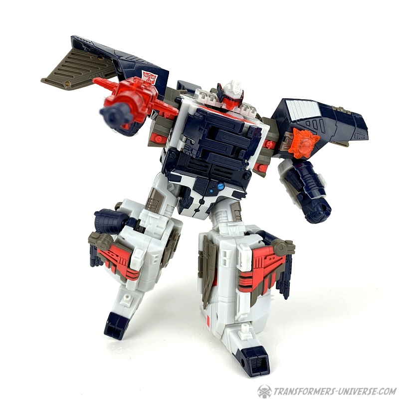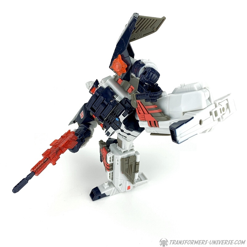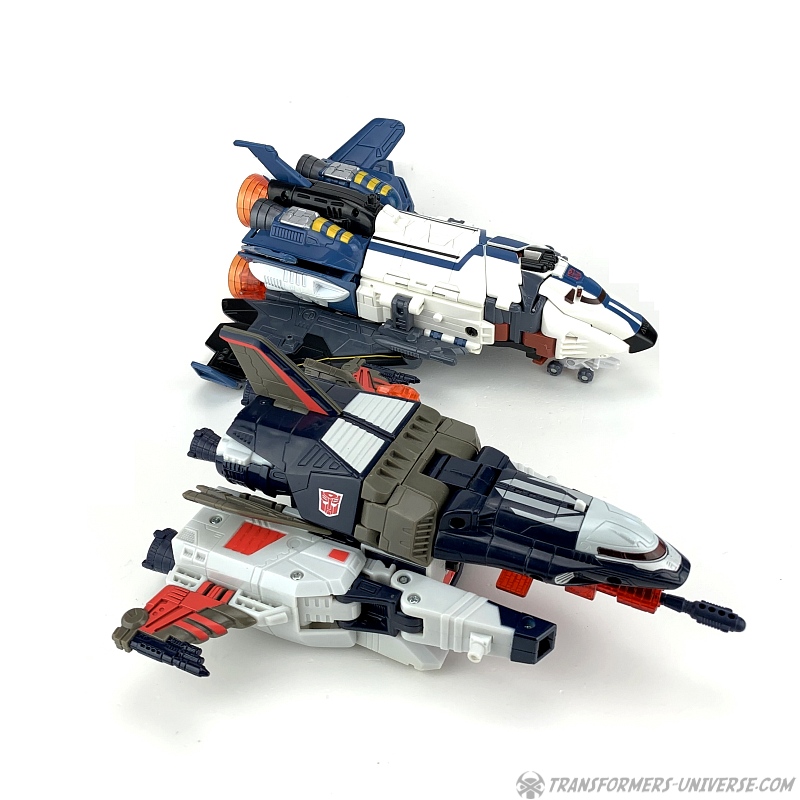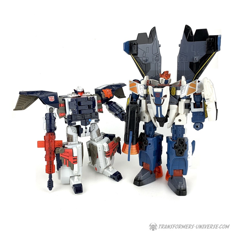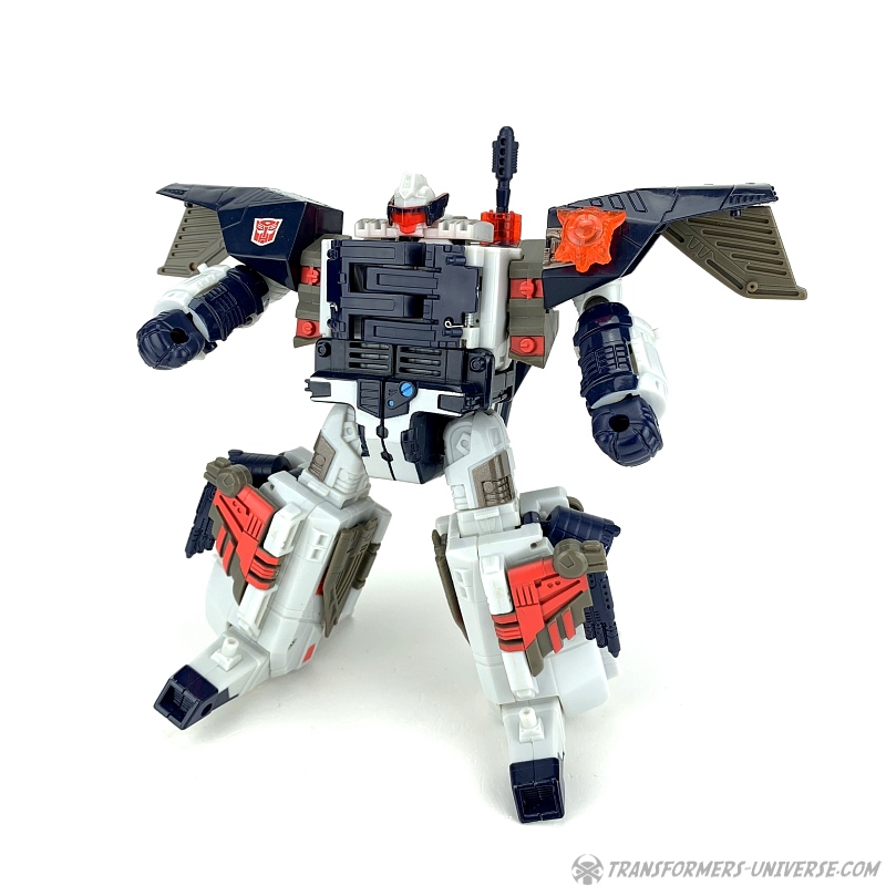 I gave the original Energon Jetfire toy a C-rating, but looking back, I think that is a tiny bit too harsh. Sure, he definitely could be better in terms of proportions and the Powerlinx-gimmick he is built around causes some issues, too, but he is a big, fun figure and he looks so much better in white and blue than in that rusty red the first one came in. So while he is not an all-time classic figure, certainly not, he is fun. So I guess I need to add a little plus behind the rating at least. Maybe it’s just the nostalgias speaking.