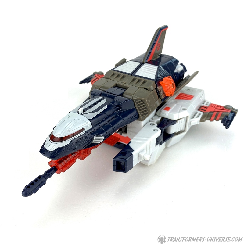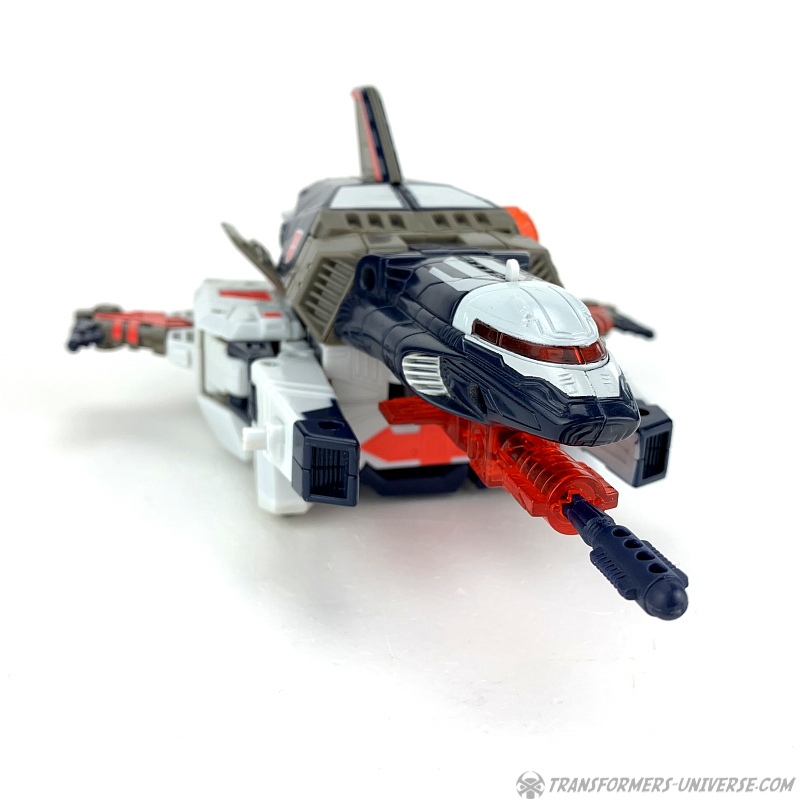 Alternate Mode: Unsurprisingly Skyfire transforms into an aircraft, a futuristic, space-shuttle-like vehicle. It doesn’t look half-bad, but like quite a few jet Transformers it has got a pretty big underbelly (basically the entire robot mode except for the arms) and there is a big empty space directly underneath the cockpit. You can somewhat fill it up by mounting the missile launcher there (and the white lever on top of the cockpit connects to it to fire the missile, nicely done), but it still doesn’t look particularly aerodynamic. Which, yes, it technically does not need to as a space shuttle, but still.