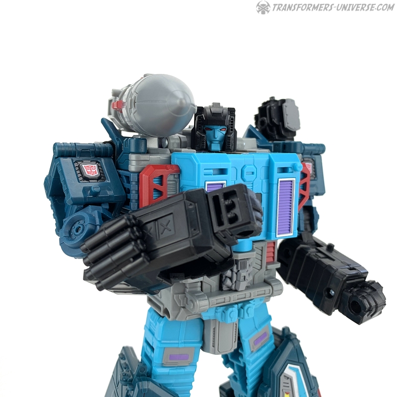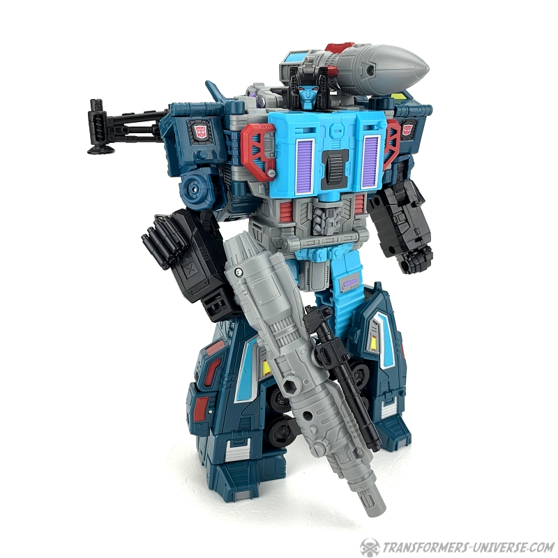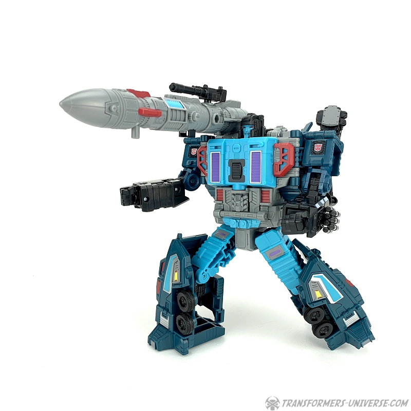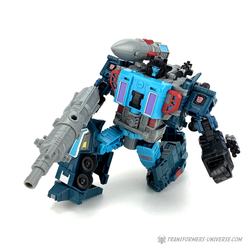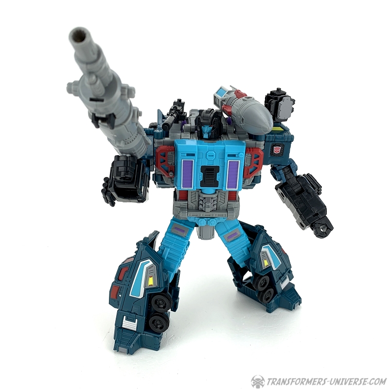 Finally, Double Dealer comes with quite the arsenal, too. Apart from his giant missile, which can split into a long rifle and a smaller missile, he has a small black rifle, two plug-in tube missile launchers and a box missile launcher (non-firing). He has numerous ports on his body where these weapons can be mounted, though traditionally the rifle goes in hand and the smaller missile on the shoulder. Nicely done. The faction symbols on his shoulders can be flipped around. Traditionally the robot is the Autobot, but you can easily turn him into a Decepticon here, too, if you want.