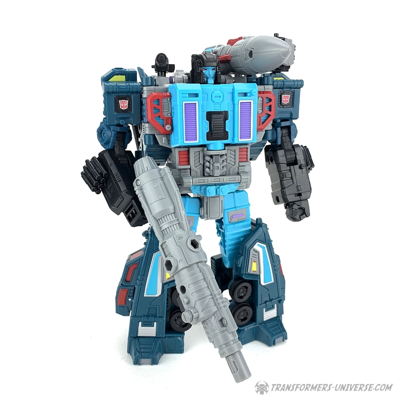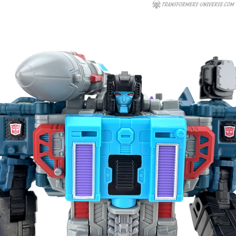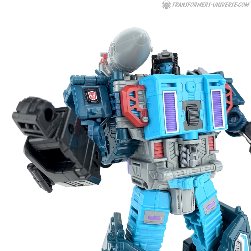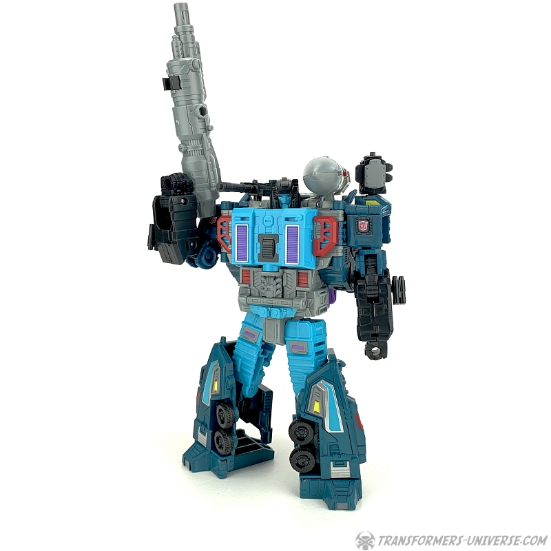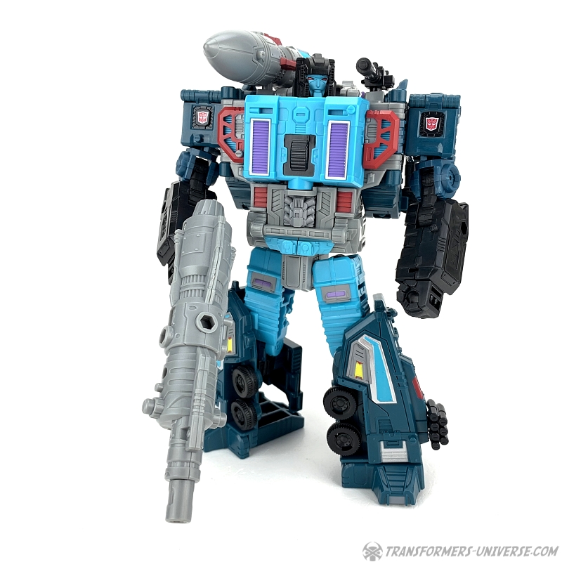 Finally, Double Dealer comes with quite the arsenal, too. Apart from his giant missile, which can split into a long rifle and a smaller missile, he has a small black rifle, two plug-in tube missile launchers and a box missile launcher (non-firing). He has numerous ports on his body where these weapons can be mounted, though traditionally the rifle goes in hand and the smaller missile on the shoulder. Nicely done. The faction symbols on his shoulders can be flipped around. Traditionally the robot is the Autobot, but you can easily turn him into a Decepticon here, too, if you want.