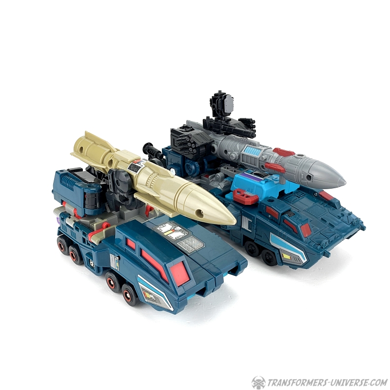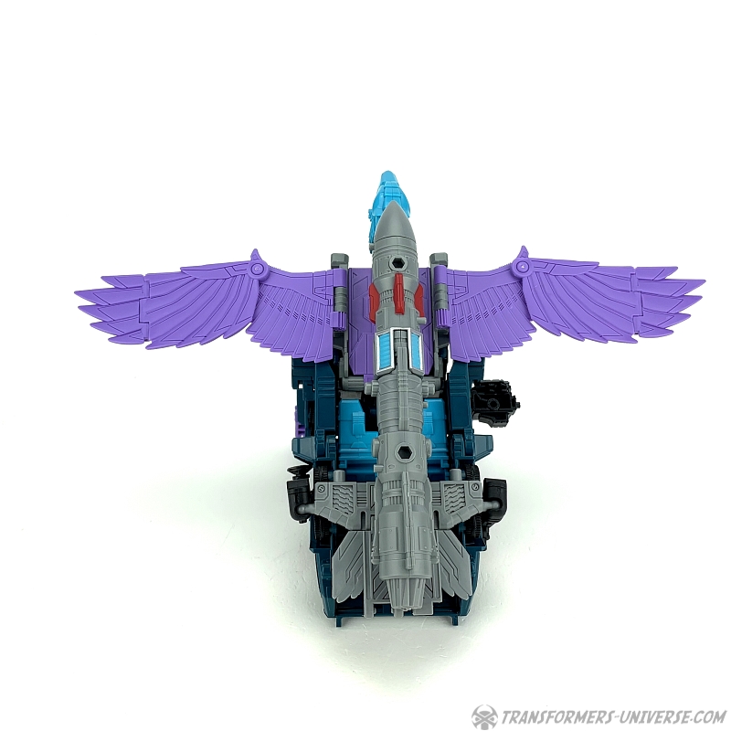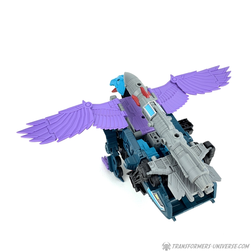 Alternate Modes: Double Dealer is a triple changer. Traditionally his robot mode was an Autobot, while his second mode, a robotic eagle, was designated a Decepticon. Much like in robot mode the resemblance to the original is very, very good. In fact the two robot eagles are more or less identical, big boxy birds. Earthrise DD has more poseable wings, but unlike the original he cannot carry part of his missile under his belly. The head is a bit more articulate, too. One big downside here, though: the tail feathers. They are the rucksack from robot mode, a detachable piece that doesn’t really stick in place all that well. Also, the big missile is mounted on that part, too, making it a bit unstable as well. So bottom line: a good robotic eagle, a great likeness to the original, but the tail feathers / rucksack thing does drag him down a bit.