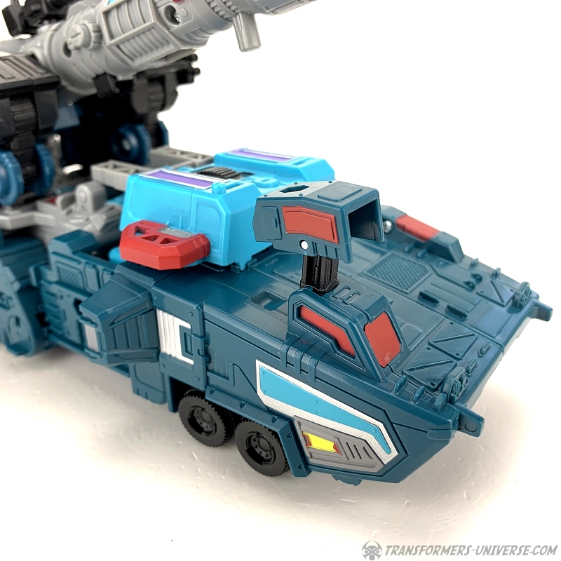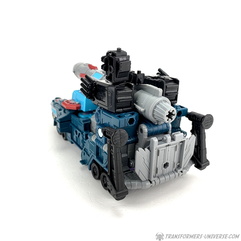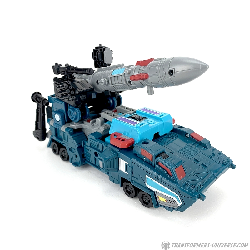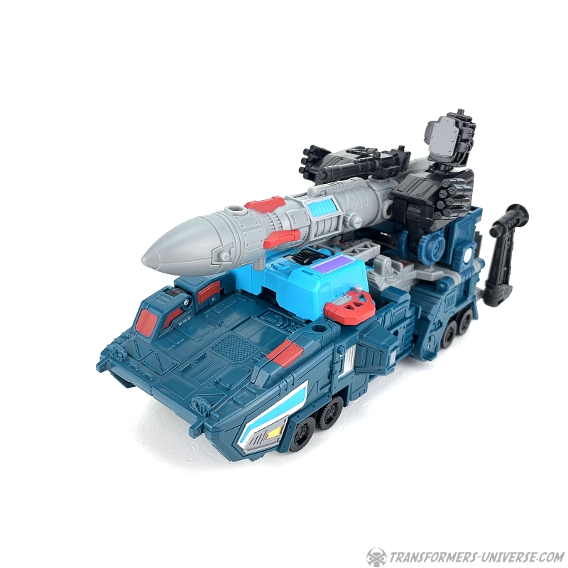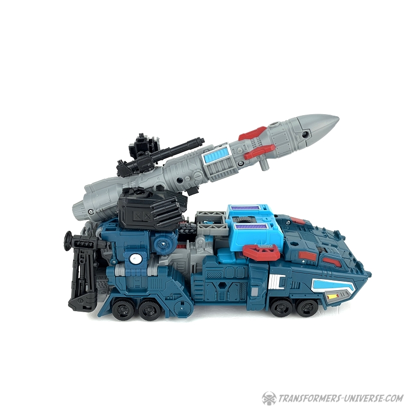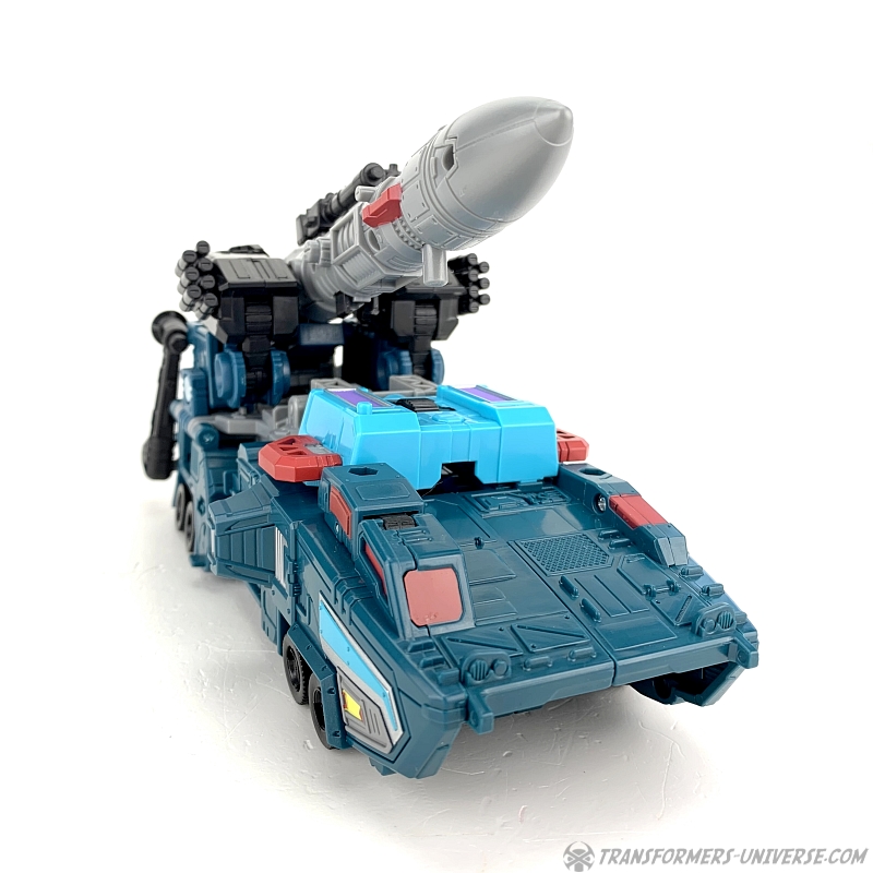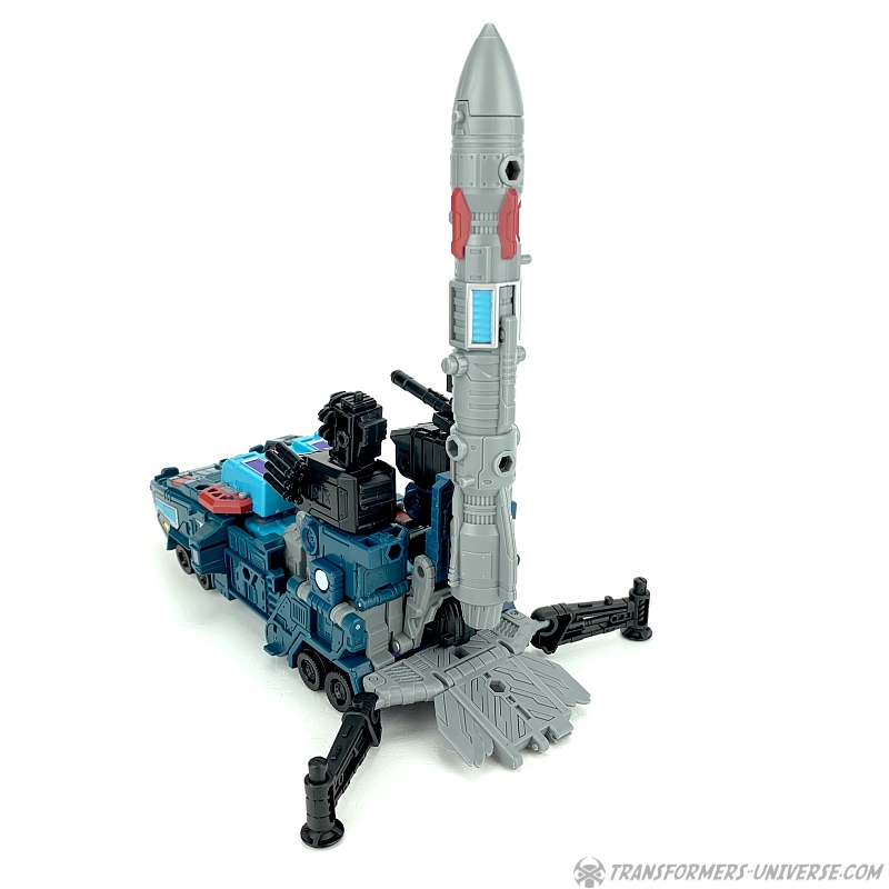 Double Dealer’s third mode, traditionally his neutral mode, is a big missile truck. Here, too, the resemblance to the original is very strong and the vehicle looks pretty good. You can scatter DD’s various weapons all over the vehicle, the big missile can be raised, everything looks great. For some reason the rear part of the driver’s cabin can flip up (see picture 27), but I have yet to figure out what that’s supposed to be for. Anyway, the vehicle looks pretty cool and for once the detachable rucksack thing doesn’t get in the way, either. In fact, it’s sole reason for being here in the first place is to turn the vehicle mode into a kind of base mode. Flip out the panel from the rucksack, raise the missile straight up, and you have a sort-of rocket base that can connect to other Earthrise bases via those connecting ramps. Not that DD really needed a base mode, but it doesn’t take anything away from the vehicle mode, so no complaints. Easily the better of DD’s two alternate modes in my mind.