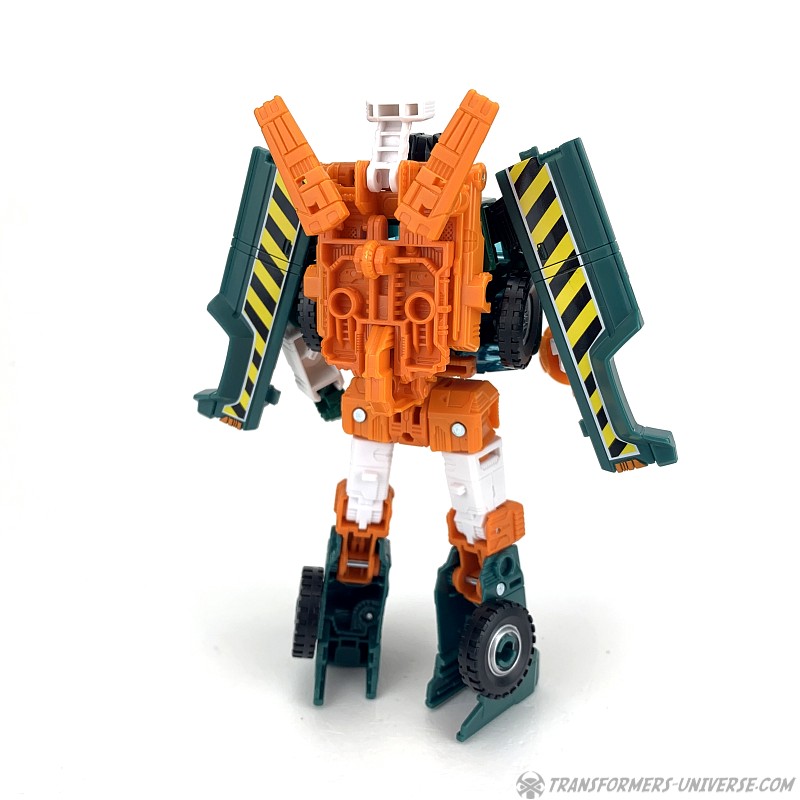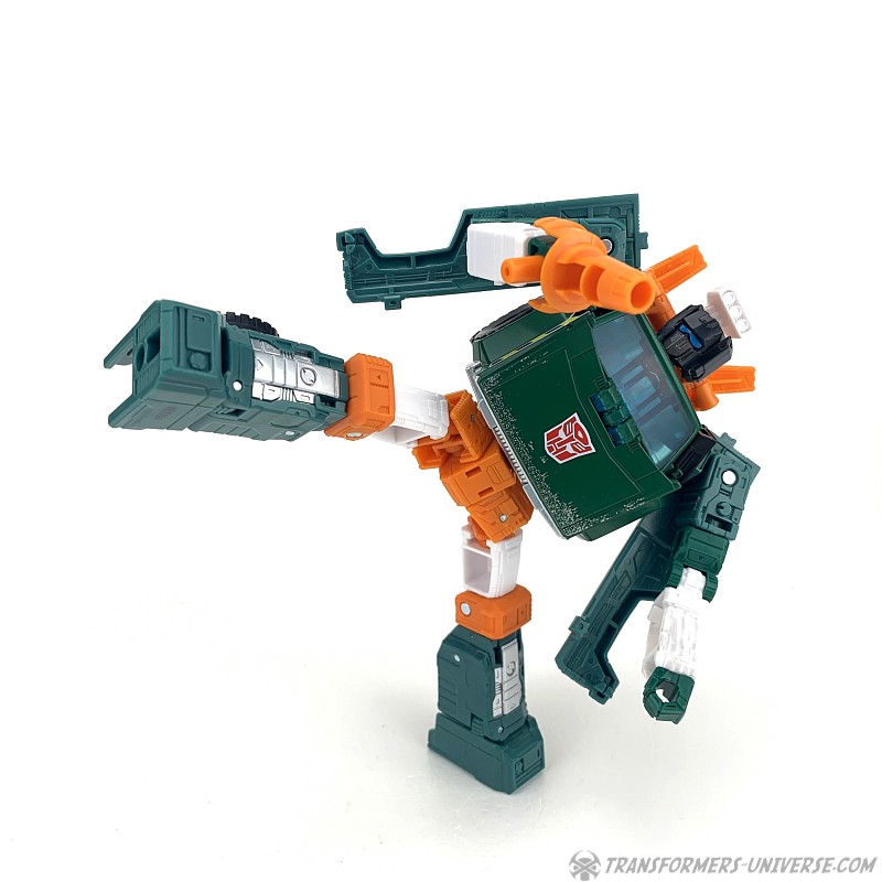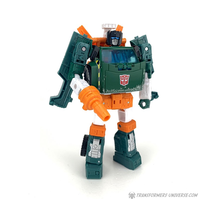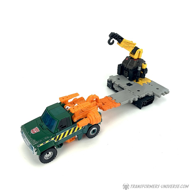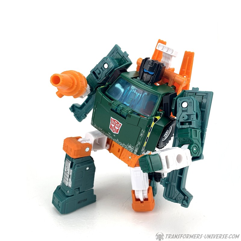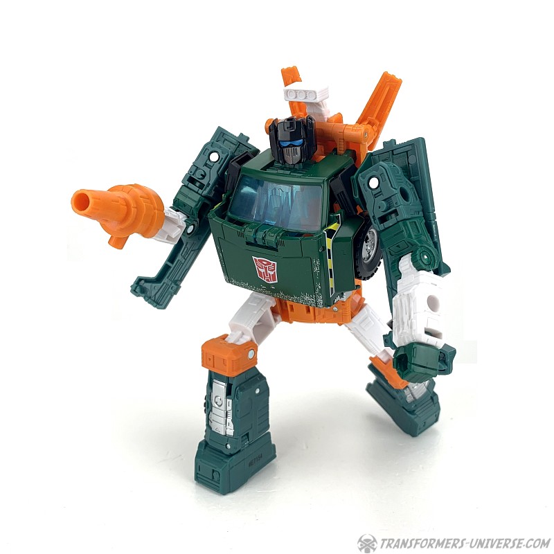 Hoist’s articulation is as good as you’d expect for a toy from that line, meaning quite good. He can kick, he can kneel, he can strut. His sole weapon is an orange cannon / welding tool / whatever he currently needs which he can put over the fist on either arm. This harkens back to the G1 toy’s ability to shoot off the fists and replace them with various missiles or other tools. Nicely done. Hoist has some battle damage deco on his chest, but it’s rather subtle and looks good.