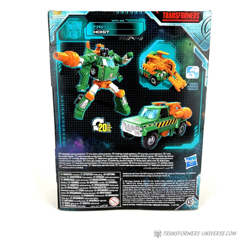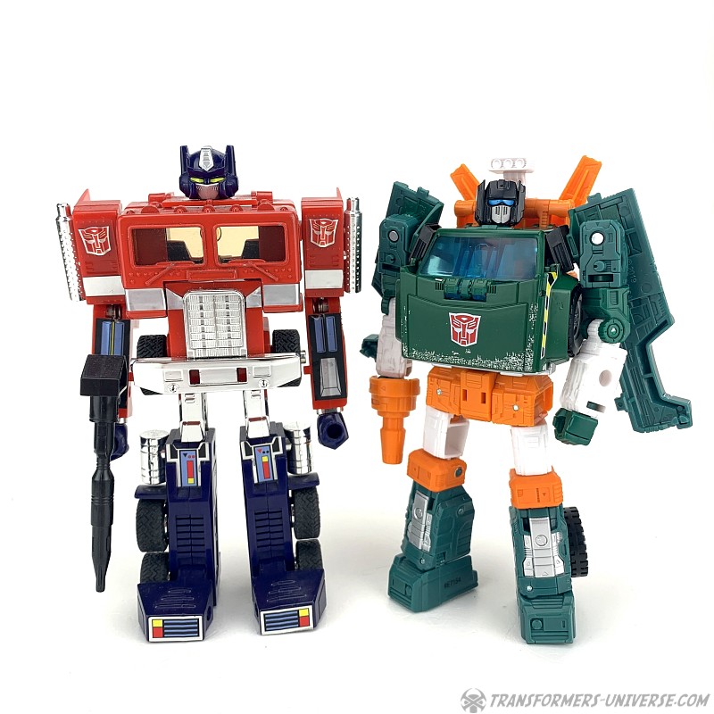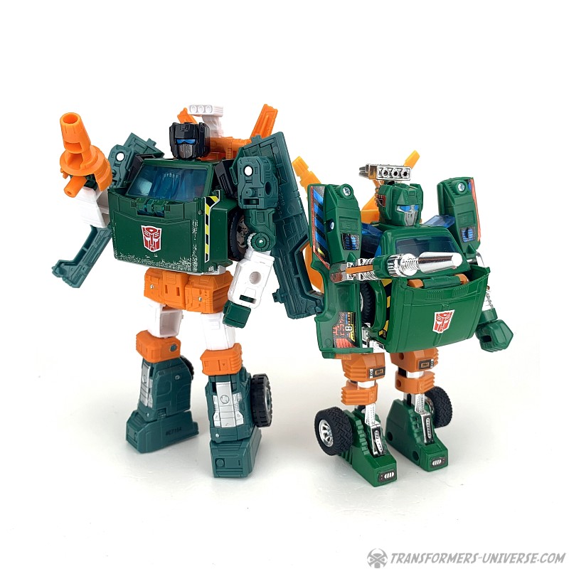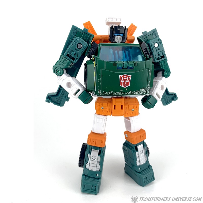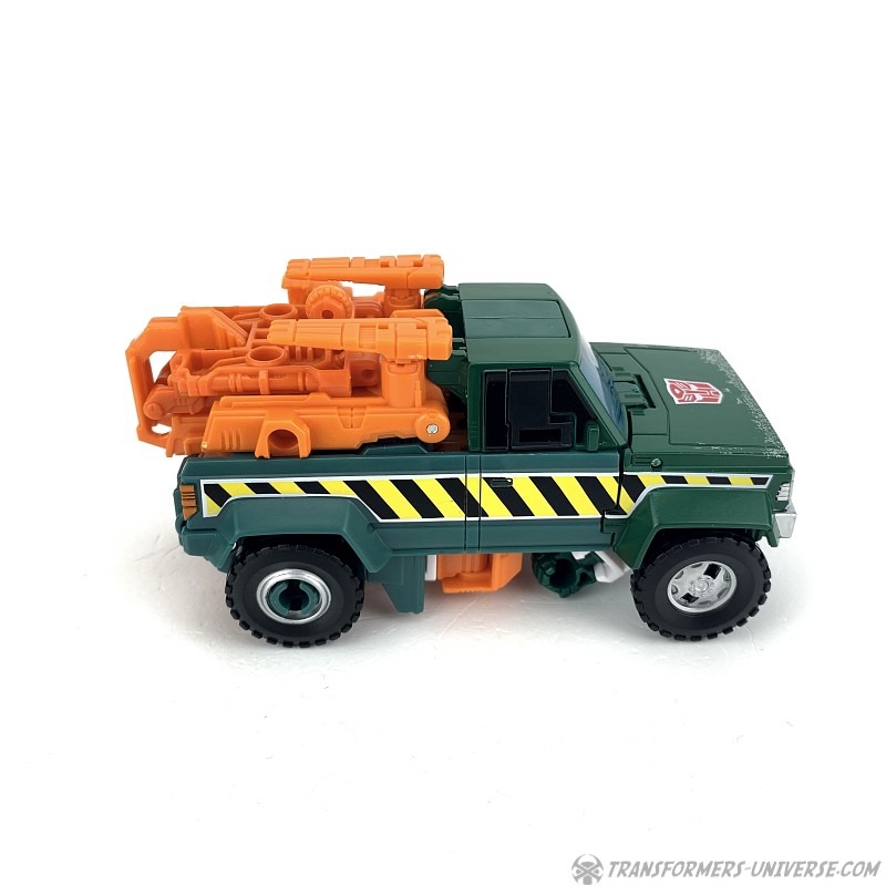 Robot Mode: Hoist is a Deluxe class figure and on the upper end of that scale, standing nearly as tall as many a Voyager figure and towering over his G1 counterpart by quite a bit. Which fits his appearance in the cartoon, where he was among the bigger Autobots (yet still small enough to fit inside Huffer’s vehicle mode). The resemblance to said cartoon appearance is also very good, even though cartoon Hoist was a bit bigger around the waist, if you know what I mean. Resemblance to the old toy is also quite close, except for the color of the head. Most toy versions of Hoist had a green head, but in the cartoon his head was grey, so this coloring here is definitely screen accurate.