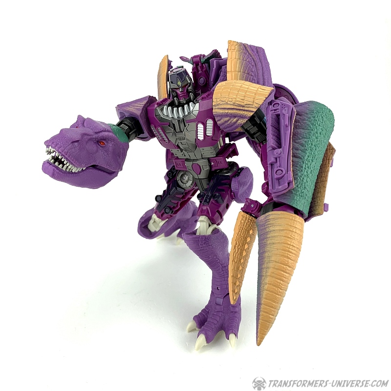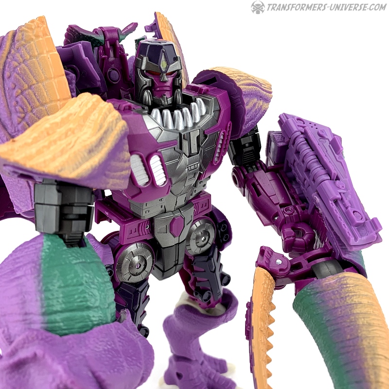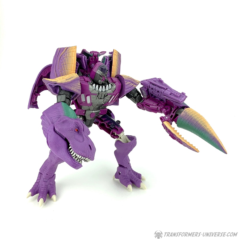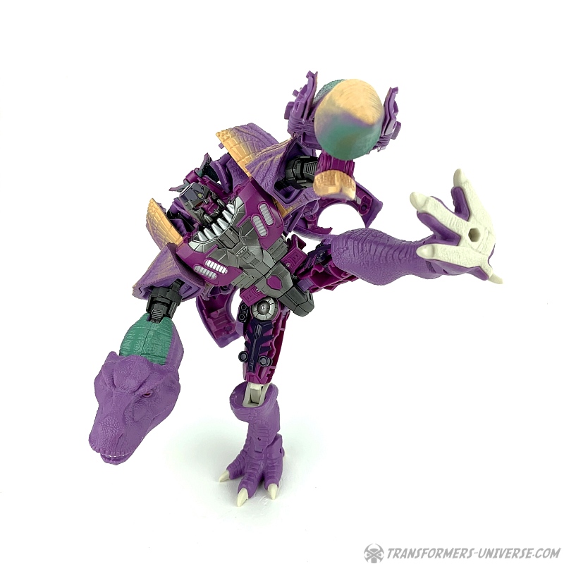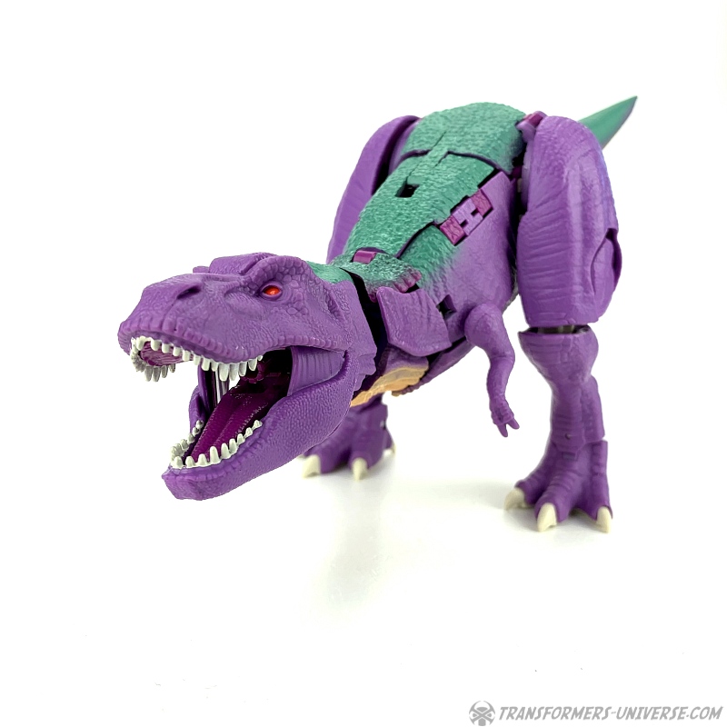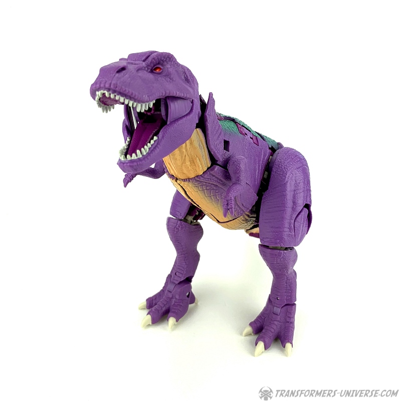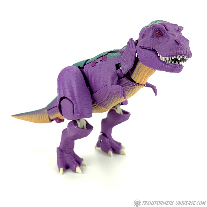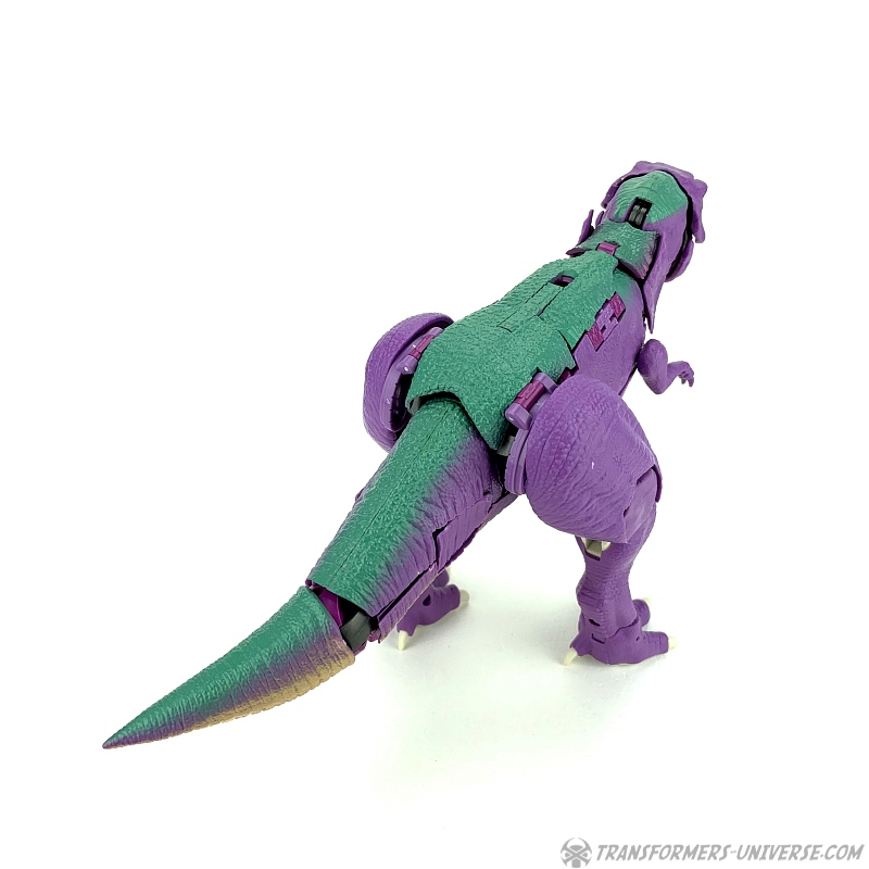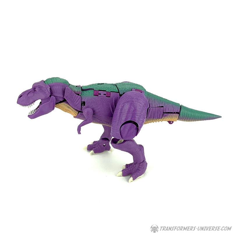 Alternate Mode: Megatron transforms into a purple Tyrannosaurus Rex. The transformation is similar to that of the 1996 figure, though a bit more complex. The resulting dinosaur is pretty large and looking pretty good in general. Whether you like his purple coloring is subjective, of course, but it’s a massive beast with fully articulate legs and even the tail can move a bit. Nicely done.