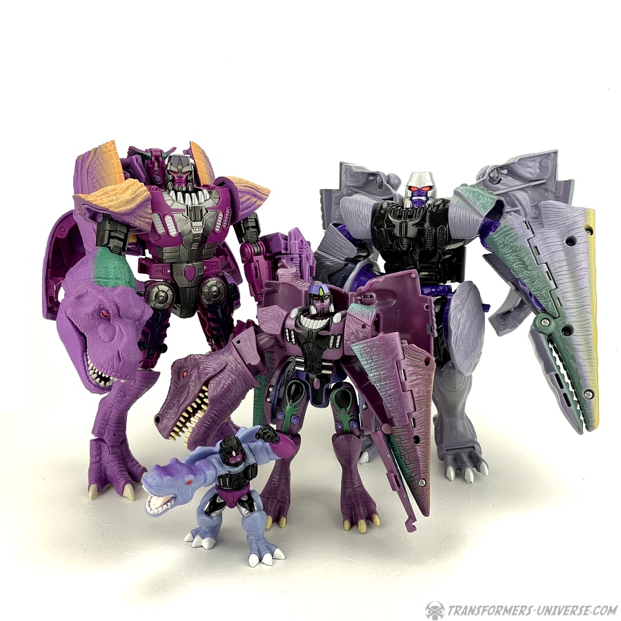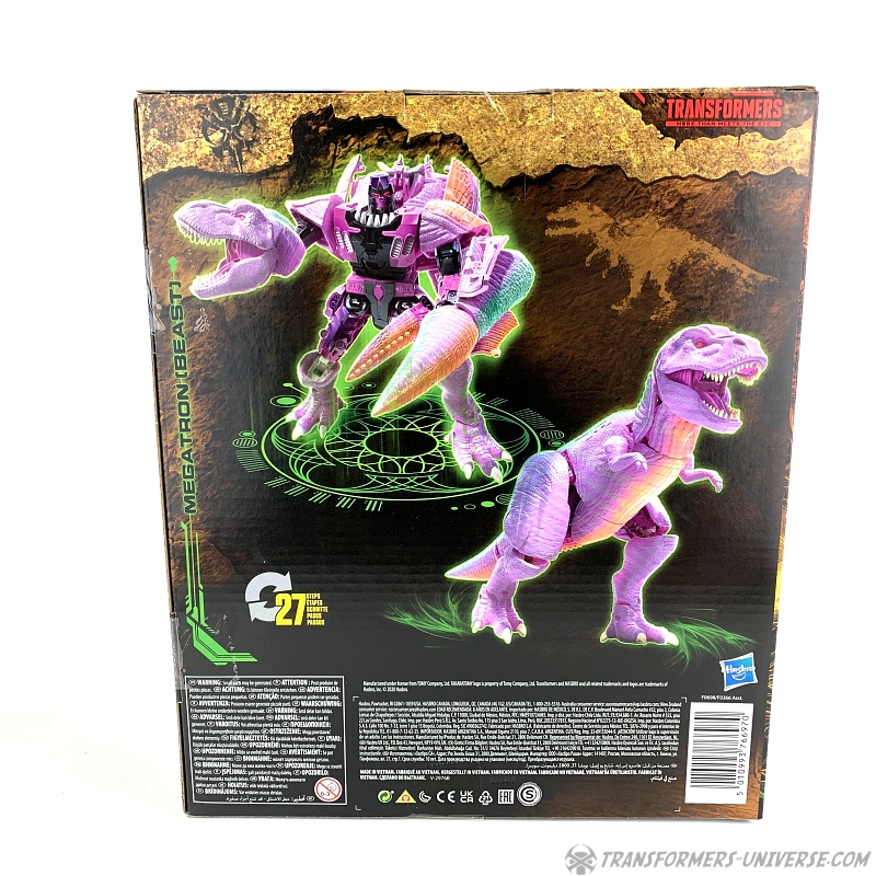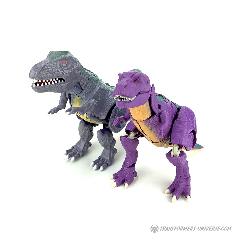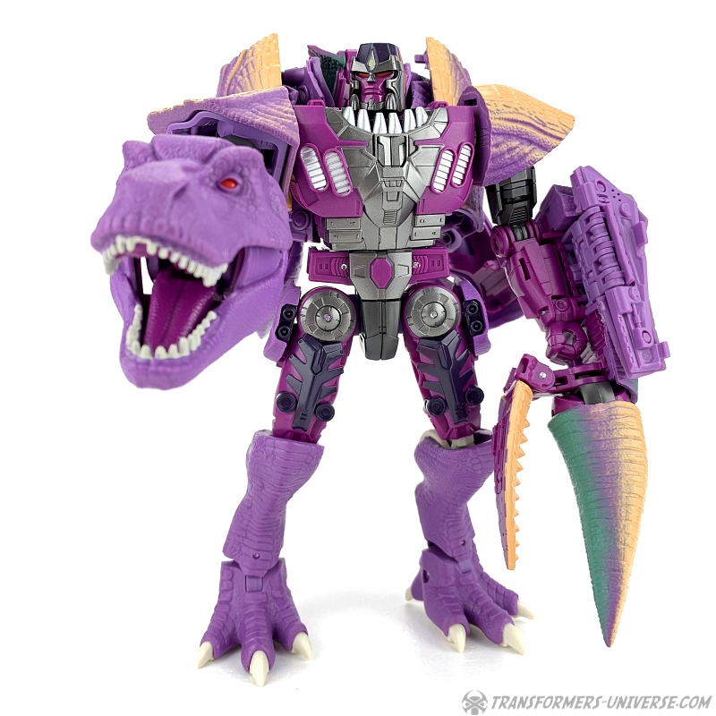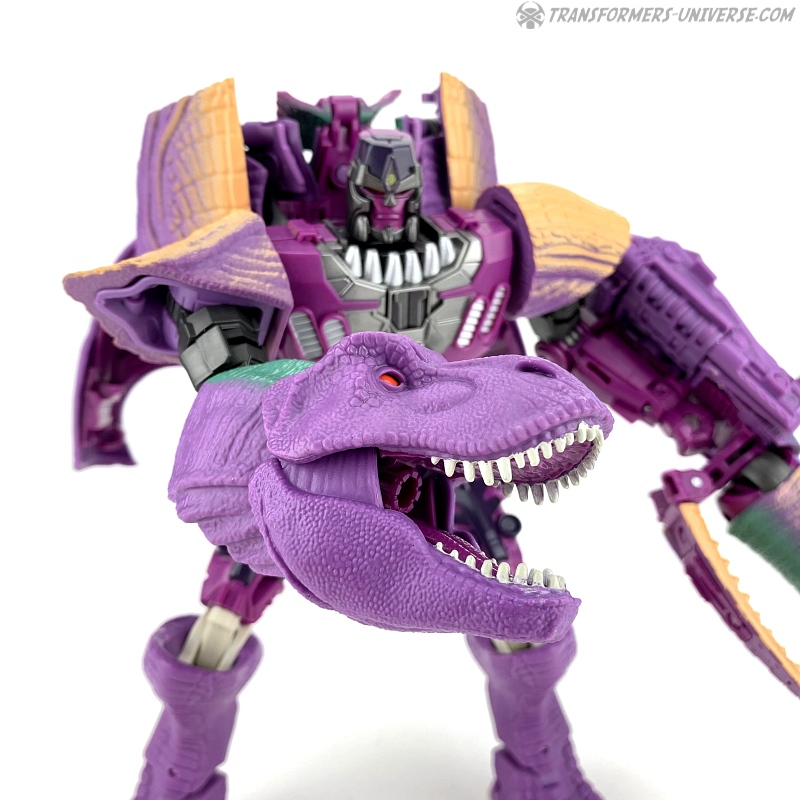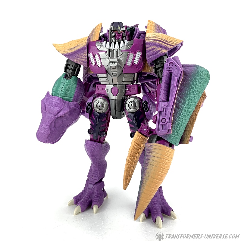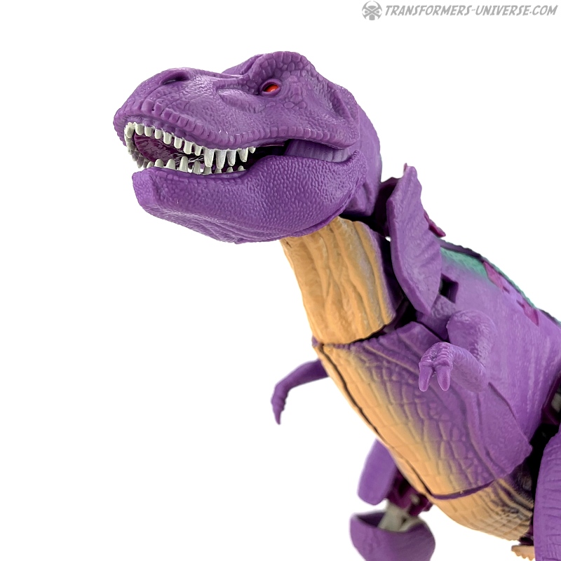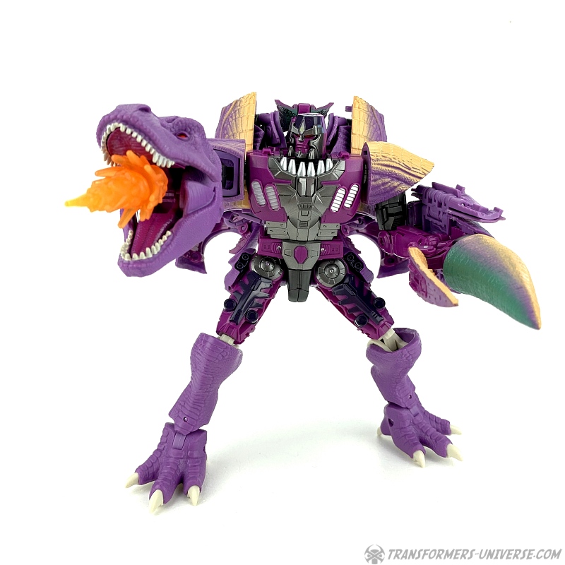 Alternate Mode: Megatron transforms into a purple Tyrannosaurus Rex. The transformation is similar to that of the 1996 figure, though a bit more complex. The resulting dinosaur is pretty large and looking pretty good in general. Whether you like his purple coloring is subjective, of course, but it’s a massive beast with fully articulate legs and even the tail can move a bit. Nicely done.