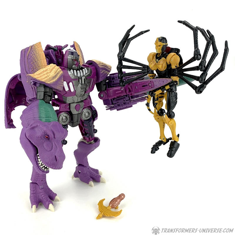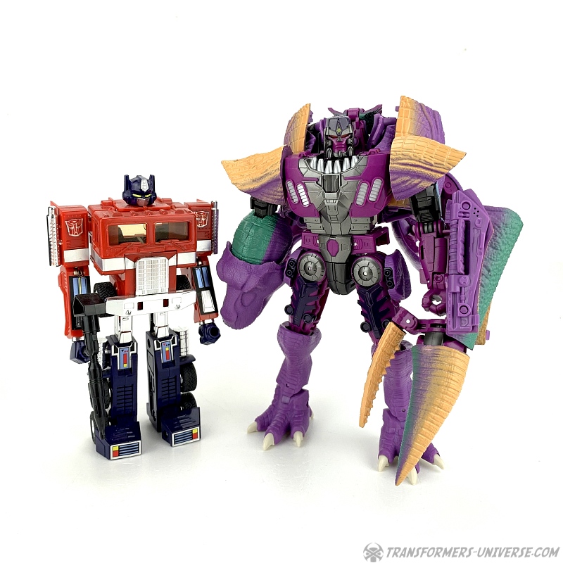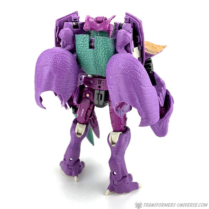 Comparisons aside, Megatron is a very well-articulated figure with a ton of detailing. His right hand ends in the T-Rex’ head, which can open its jaws pretty wide and has a port for attaching blast effects inside. The other arm is the T-Rex tail, which turns into a pincer. Unlike the original figure, you actually see a robot hand here. Would have been nice if the pincer were detachable, but that’s just a minor thing. I could have done without the folded-together plates hanging off his forearm, but the pincer is big and stable enough to actually grab Deluxe-class figures and hold them aloft without problems. Speaking of folded-together plates, though, there are quite a few of them on his back, too. A bit more streamlined than those huge shell-wings 1996 Megatron had, but still quite a bit.