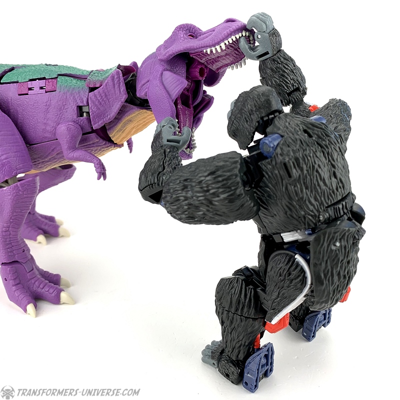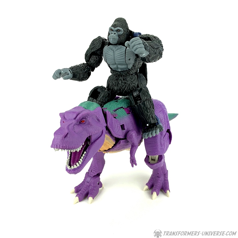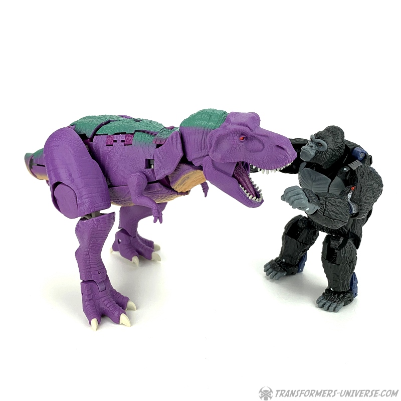 As mentioned above Megatron is very nicely articulated in this mode as well, you can do running poses and such without problems. That does pose a bit of a problem of its own, though, as Megatron’s knees open up quite a bit when he bends them, showing a white joint inside. Kind of looks a bit weird here. Apart from that, though, I have no true complaints. A very nice, very massive T-Rex mode. Big enough for Optimus Primal to ride on it.
