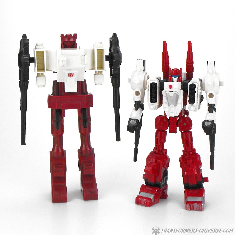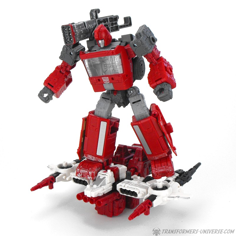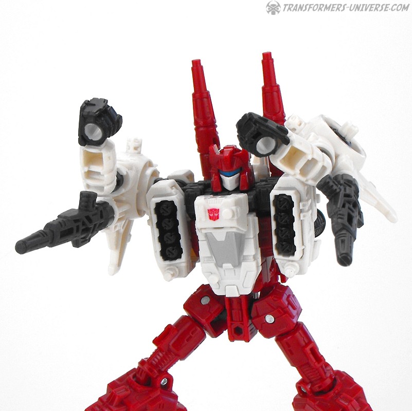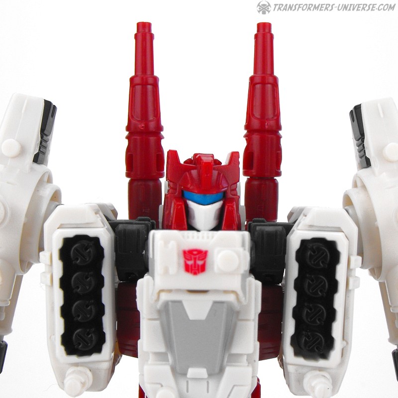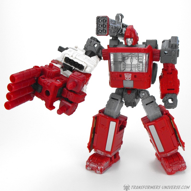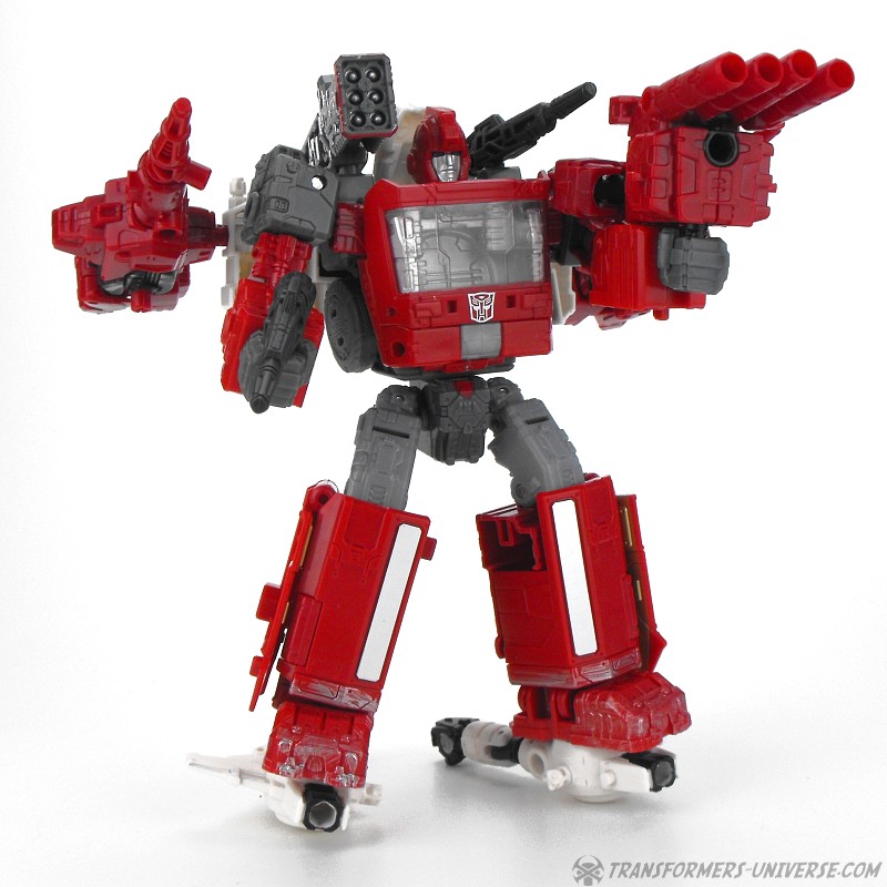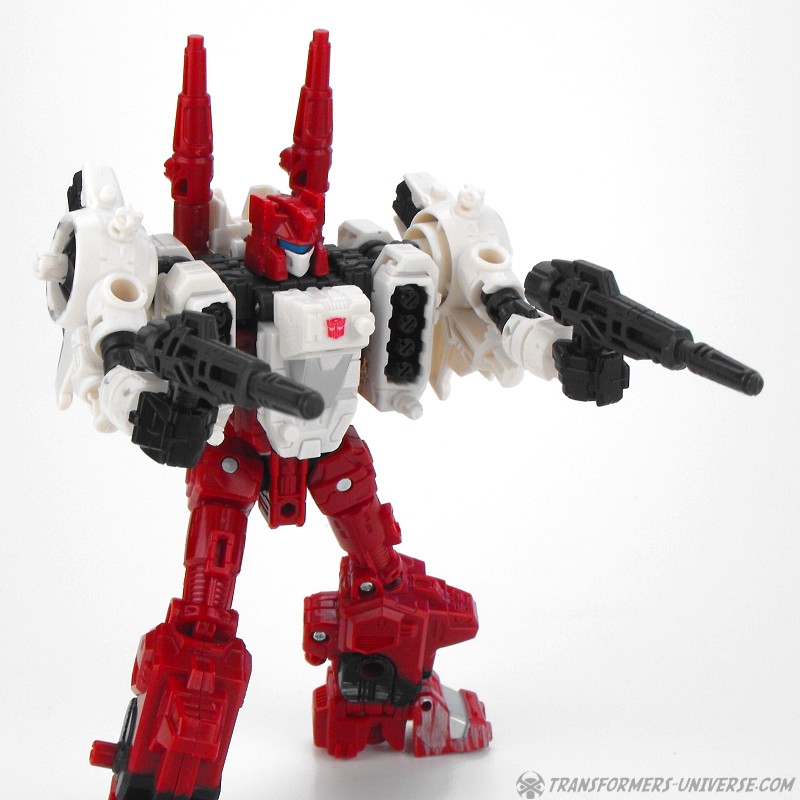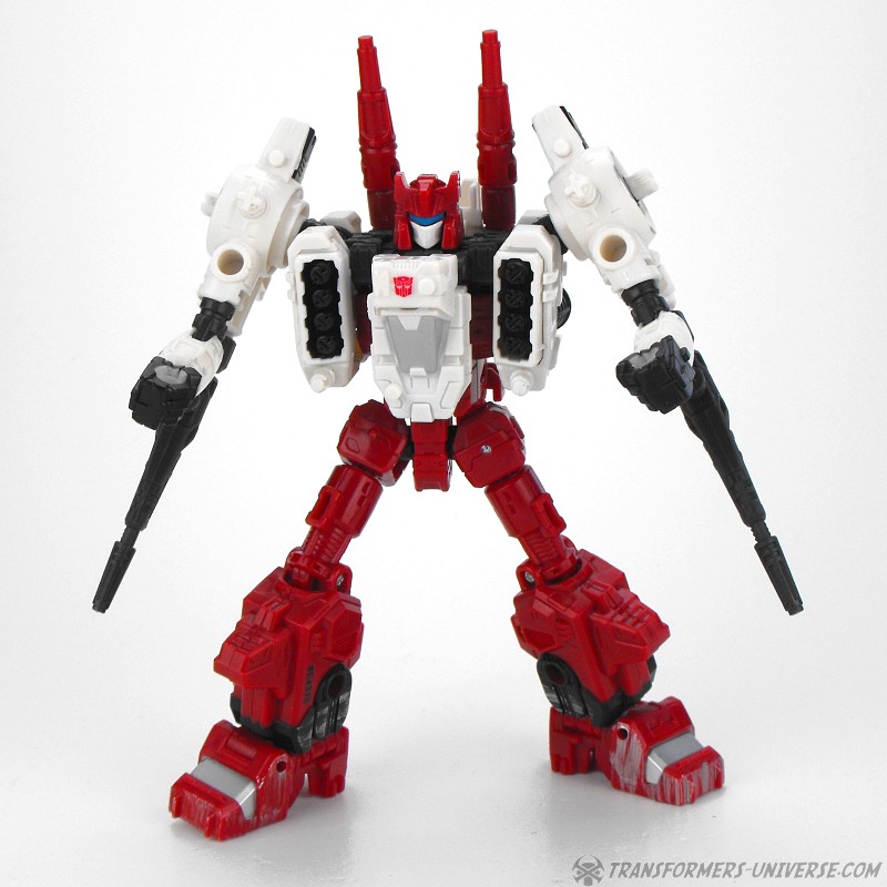 Robot Mode: In robot mode Sixgun greatly resembles his look in his sole in-media appearance (see below), rather than the look of the G1 figure. It starts with having actual arms and hands instead of just gun barrels. The resemblance is pretty good and despite being mostly white and red, Sixgun shows a fair amount of detailing, too. Despite being assembled from guns, Sixgun is a very nicely articulated figure, capable of pulling of all sorts of poses easily. His big feet give him a stable stance, so no problems there, either.