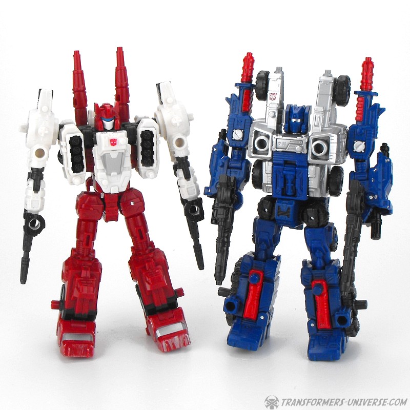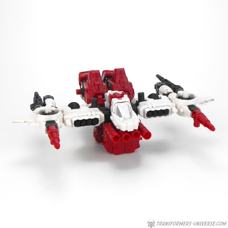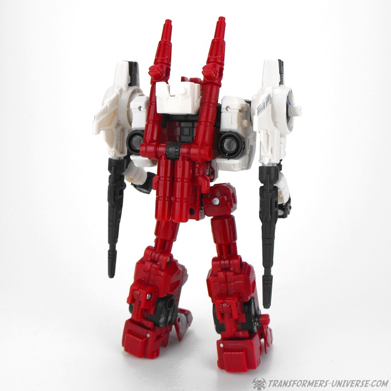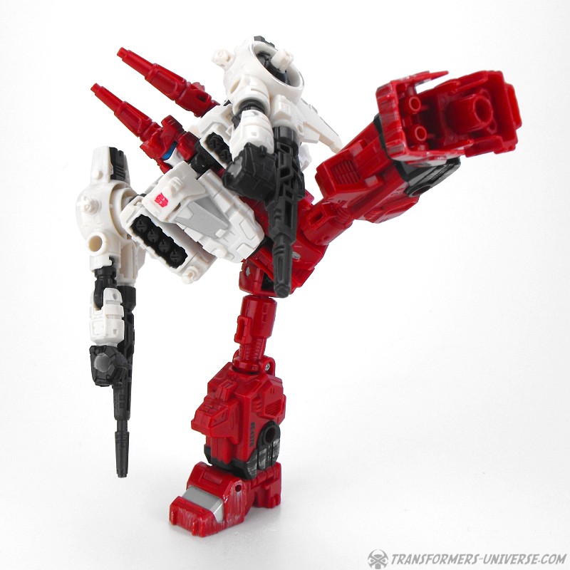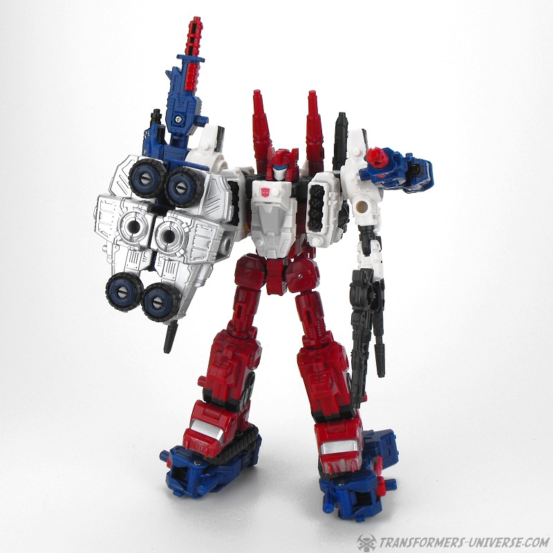 The actual point of Sixgun is, of course, that he can disassemble into a number of weapons and accessories. Chief among them the red rifles that Metroplex used to carry, which are formed from Sixguns’ legs, as well as the black-and-white guns that form his arms. The tips of each rifle are separate pieces that can be swapped or used individually. His torso becomes a white shield of sorts and his back is a blocky four-barreled blaster of some sort. Now technically Sixgun doesn’t actually become six guns, but there are so many possible variations here that you can easily assemble six different guns if you must.
